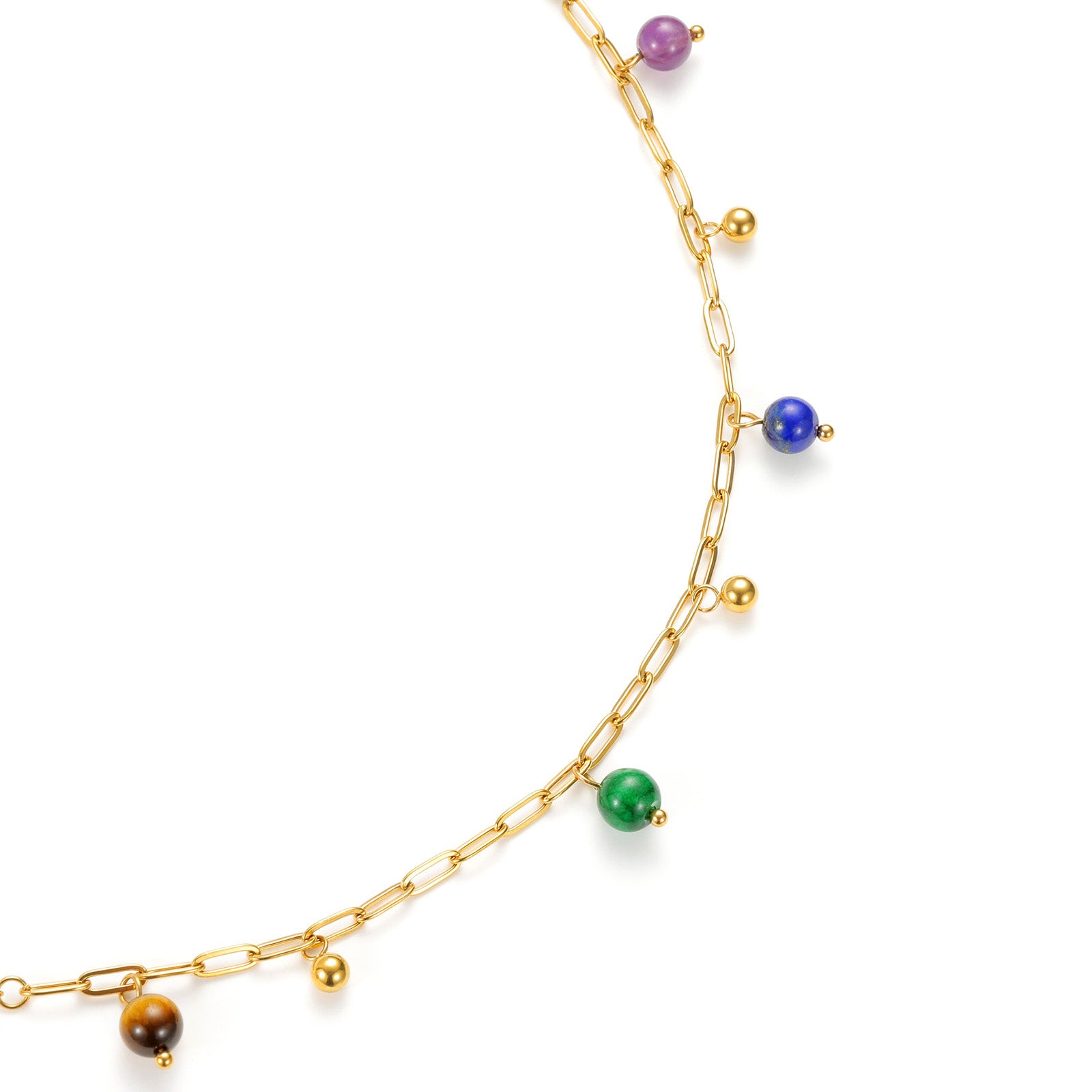 A vibrant twist on your everyday chain bracelet. This design features a sleek gold elongated-link chain accented with mini gold beads and colorful gemstone charms in rich purple, blue, green, and warm tiger’s eye tones. Each charm adds a hint of movement and personality, making this bracelet perfect for layering or wearing as a subtle statement on its own. Water-resistant, tarnish-free, and hypoallergenic for effortless daily wear.