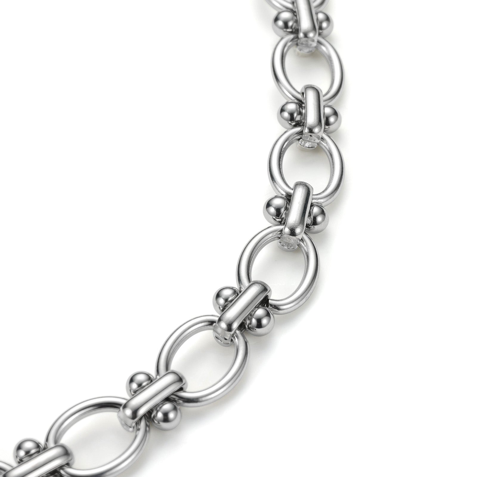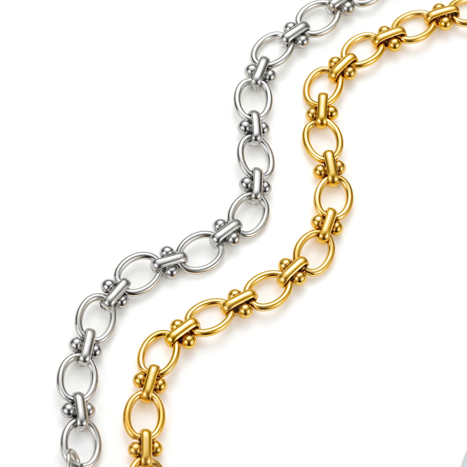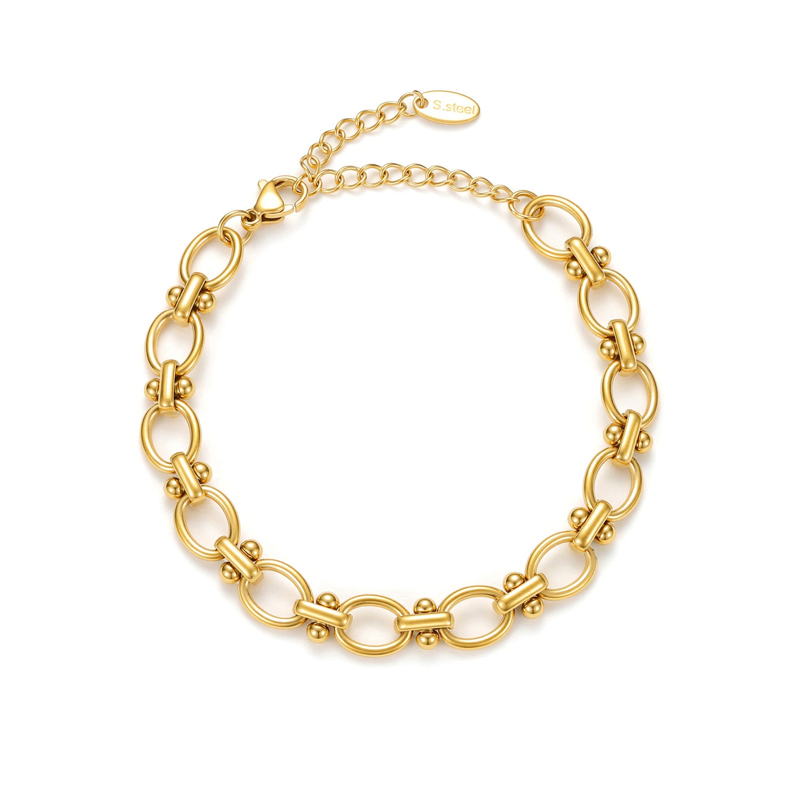 A modern statement piece with a clean, structured silhouette. This oval-link bracelet features rounded loops connected by small bead-accented bars, creating a bold yet minimalist look that elevates any outfit. Lightweight, comfortable, and designed for everyday wear, it stays water-resistant, tarnish-free, and hypoallergenic — your ideal go-to for effortless shine.