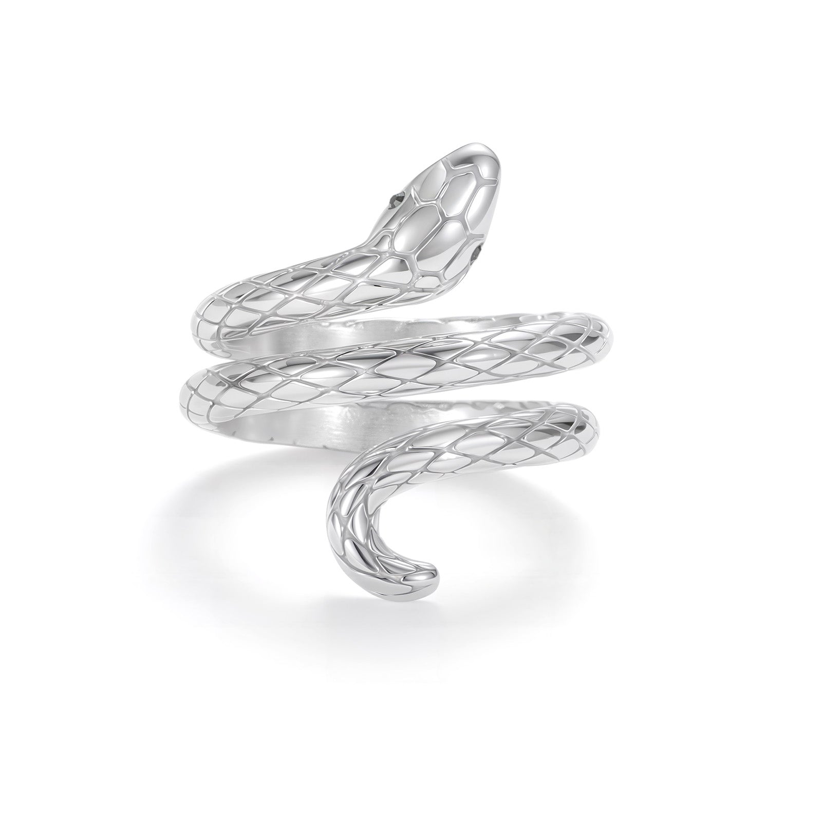 A bold serpent coil ring featuring an elegant snake wrapped design with detailed scale texture for a sculptural look around the finger. This snake wrap statement ring symbolizes transformation and protection while adding a striking modern edge. Available in radiant gold and sleek silver, this textured serpent wrap band offers a striking, minimalist, edgy jewelry look. A versatile, statement fashion ring perfect for adding a touch of modern mystery to your everyday style.