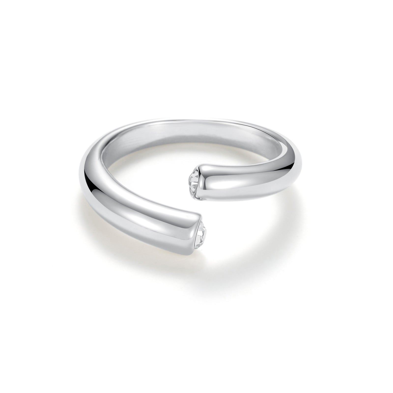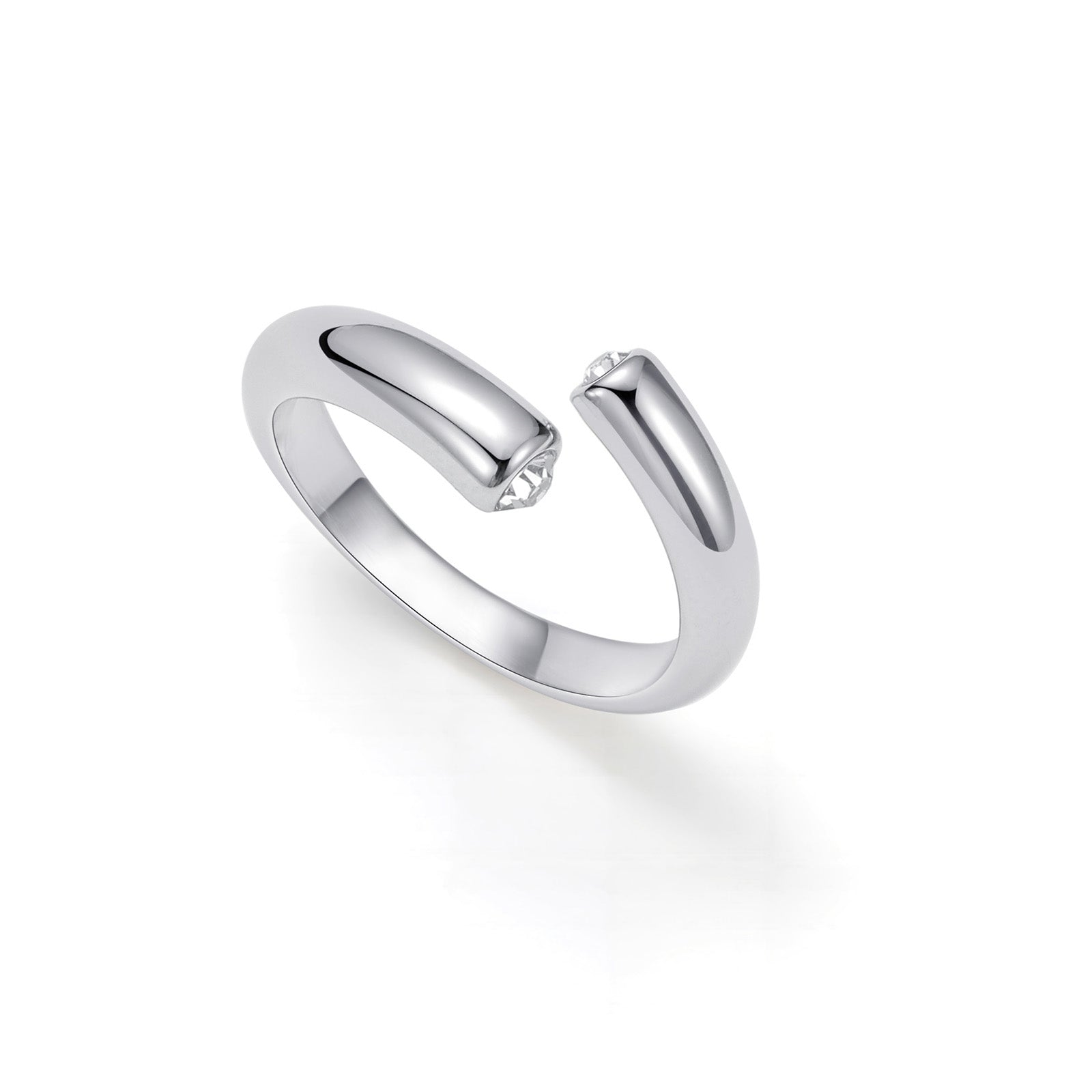 Silver adjustable open ring featuring dual cubic zirconia tips, sleek minimalist cuff style band.
